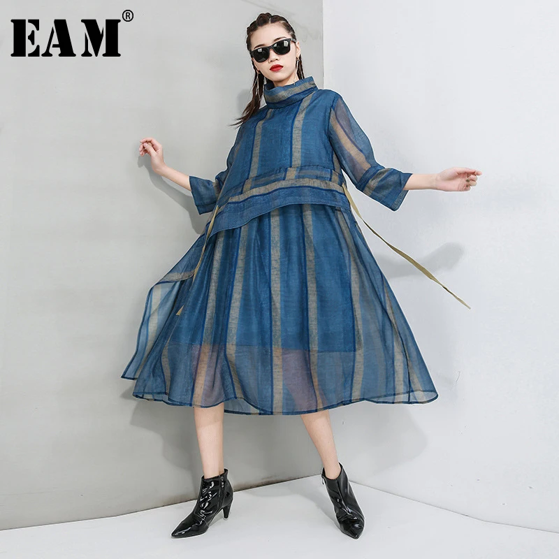 Женское Сетчатое платье EAM, платье с высоким воротом и рукавом три четверти, весенне-Осенняя мода 2020 1T554