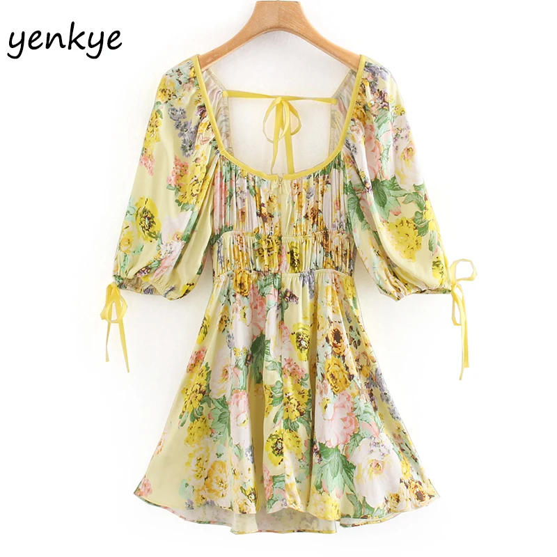 Разноцветное мини-платье с цветочным принтом, женское сексуальное платье на шнуровке с квадратным вырезом и рукавами-фонариками, летнее праздничное платье трапециевидной формы, короткое платье для женщин