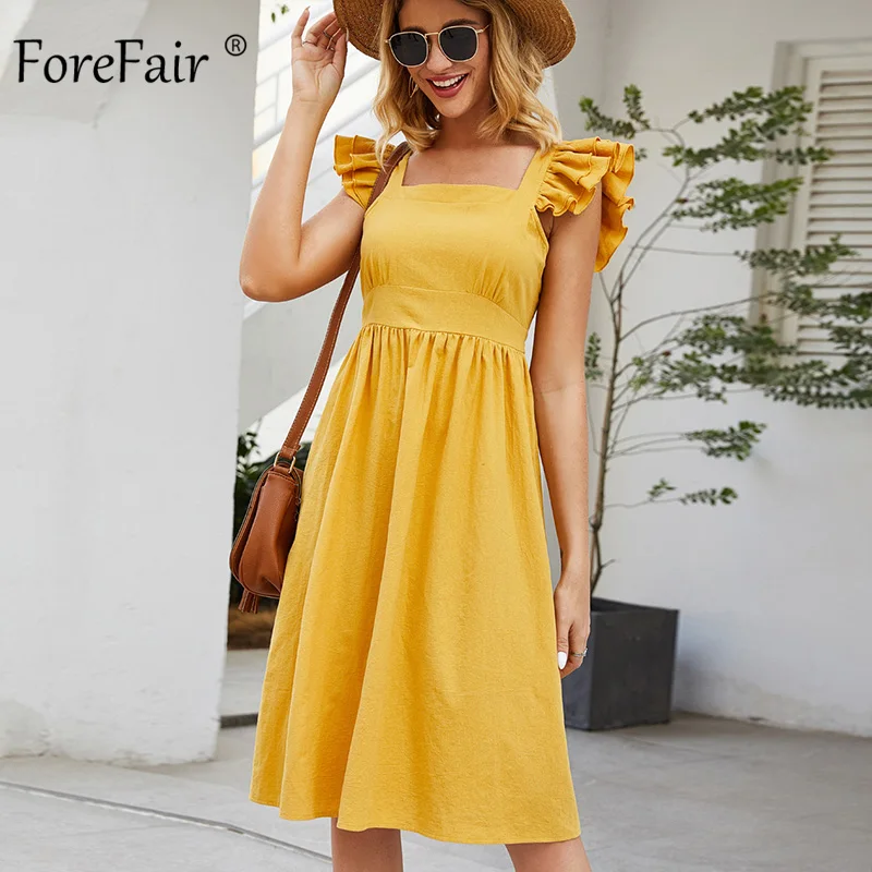 Женское пляжное платье с оборками Forefair, желтое платье с квадратным вырезом и талией, новинка 2020