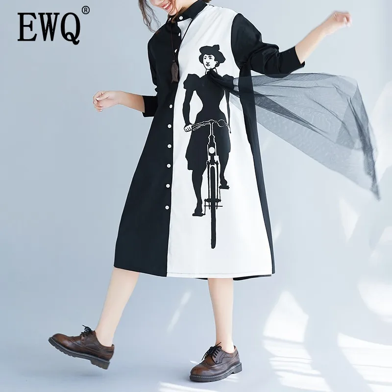 [EWQ] Новинка 2019 года; сезон весна; модное Свободное платье с длинными рукавами и принтом; цвет черный, белый; в стиле пэчворк; однобортное своб...