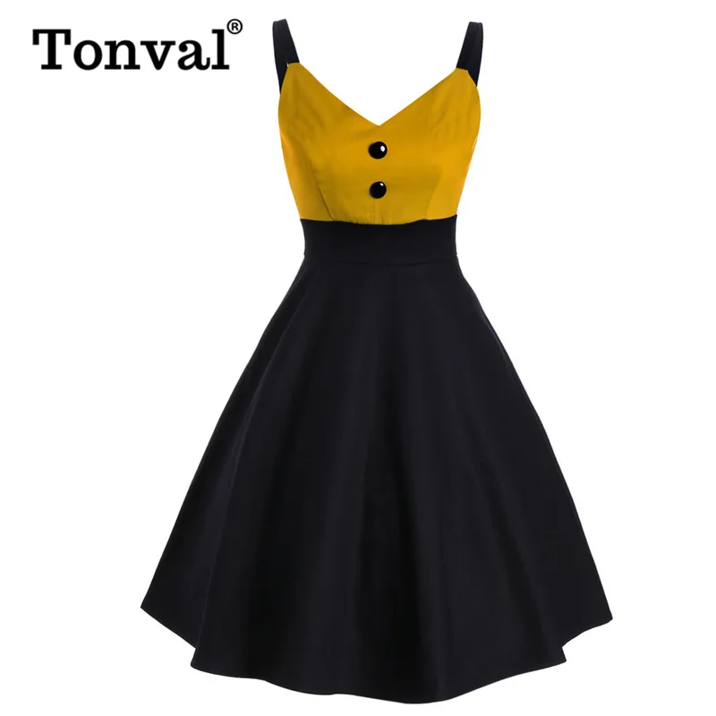 Tonval винтажное желтое и черное платье на бретельках с пуговицами спереди и высокой талией, платье-клеш до середины икры