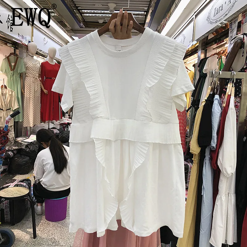 Женское платье с круглым вырезом [EWQ], однотонное Повседневное платье в стиле пэчворк с короткими рукавами и оборками, весна-лето 2020