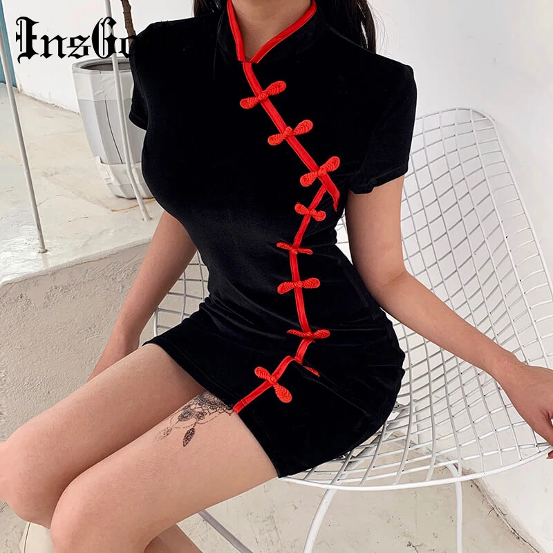 InsGoth, винтажное облегающее платье, черное, Cheongsam, короткий рукав, сексуальное женское мини-платье, готический стиль, уличная одежда, женское в...
