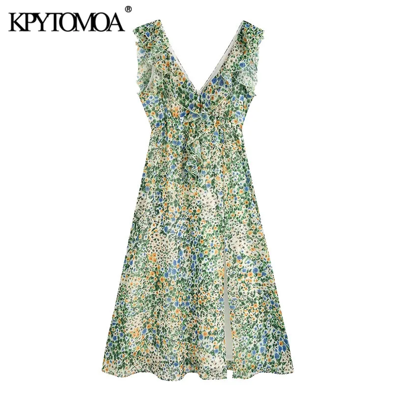 Женское платье миди KPYTOMOA, винтажное платье с цветочным принтом, v-образным вырезом, без рукавов, с разрезом сбоку, 2020