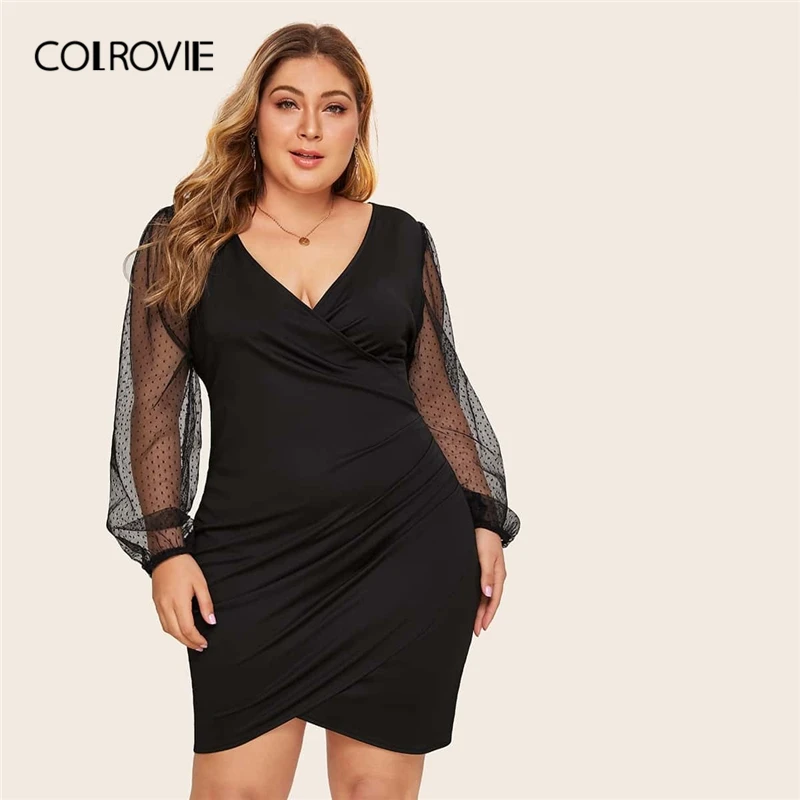 COLROVIE размера плюс платье с контрастной сеткой с рукавом Бишоп женское черное сексуальное мини платье 2020 V образным вырезом одноцветные гламурные платья