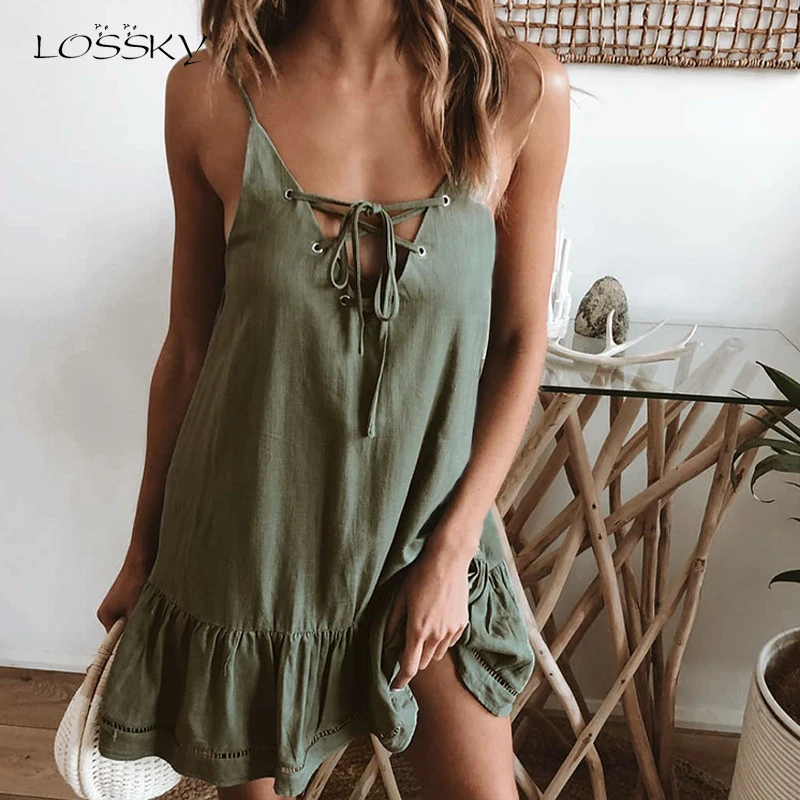 LOSSKY 2019 летнее сексуальное платье с глубоким v-образным вырезом для женщин без рукавов Слинг элегантные платья с бантом женские пляжные плат...