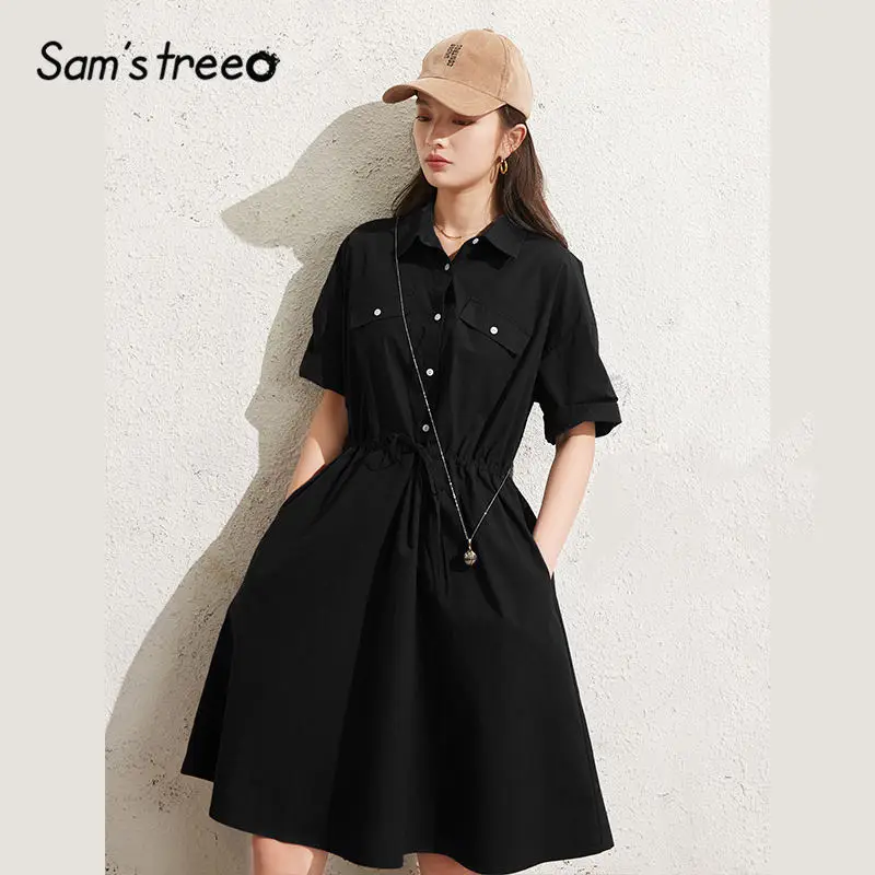 Женское платье-рубашка SAM'S TREE, зеленое однотонное Повседневное платье с завязками на талии, лето 2020, новое черное Повседневное платье с коротким рукавом в Корейском стиле