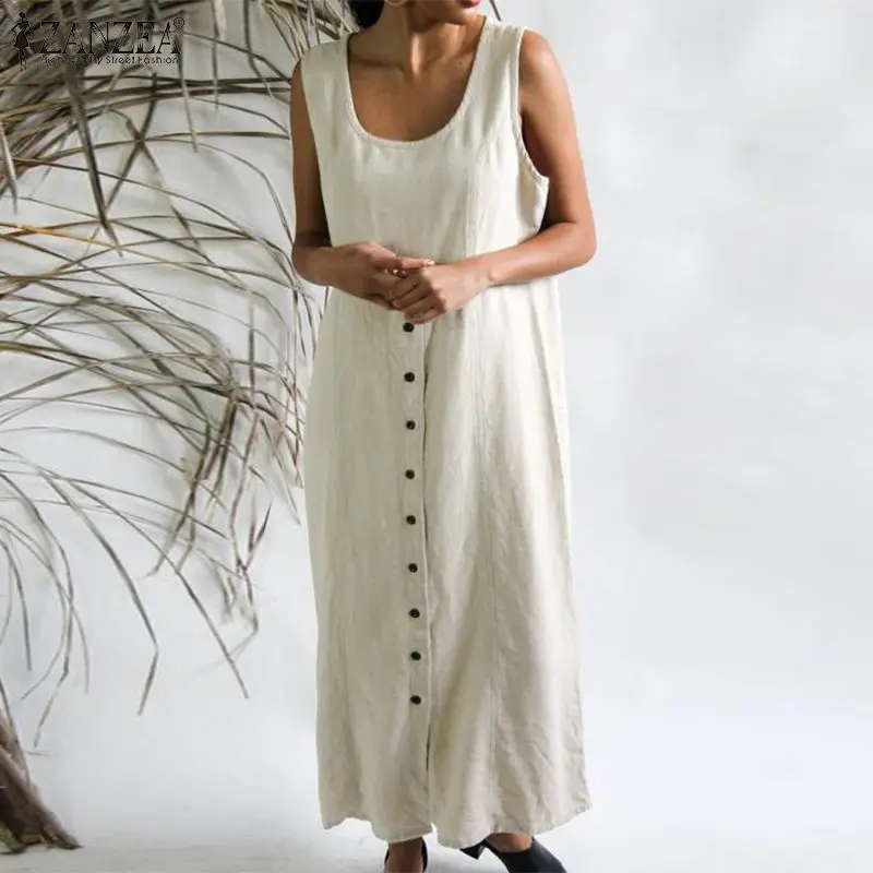 ZANZEA летнее платье без рукавов, из хлопка и льна длинное платье Для женщин элегантные пуговицы плотное летнее платье Повседневное Femme рабочие туфли из органической кожи Vestido сарафаны Халат