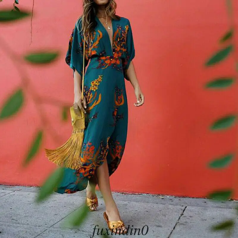 Цветочный Boho пляжное платье плюс размер женское летнее с v-образным вырезом с оборками короткий рукав цветок макси длинные платья с поясом ж...