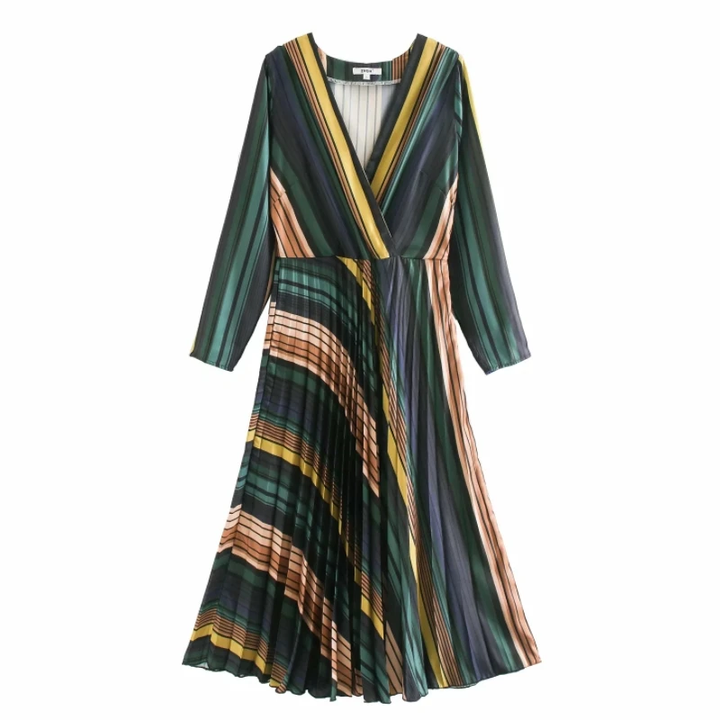 Женское винтажное плиссированное платье миди в разноцветную полоску с перекрестным v-образным вырезом, женские шикарные вечерние платья с ...