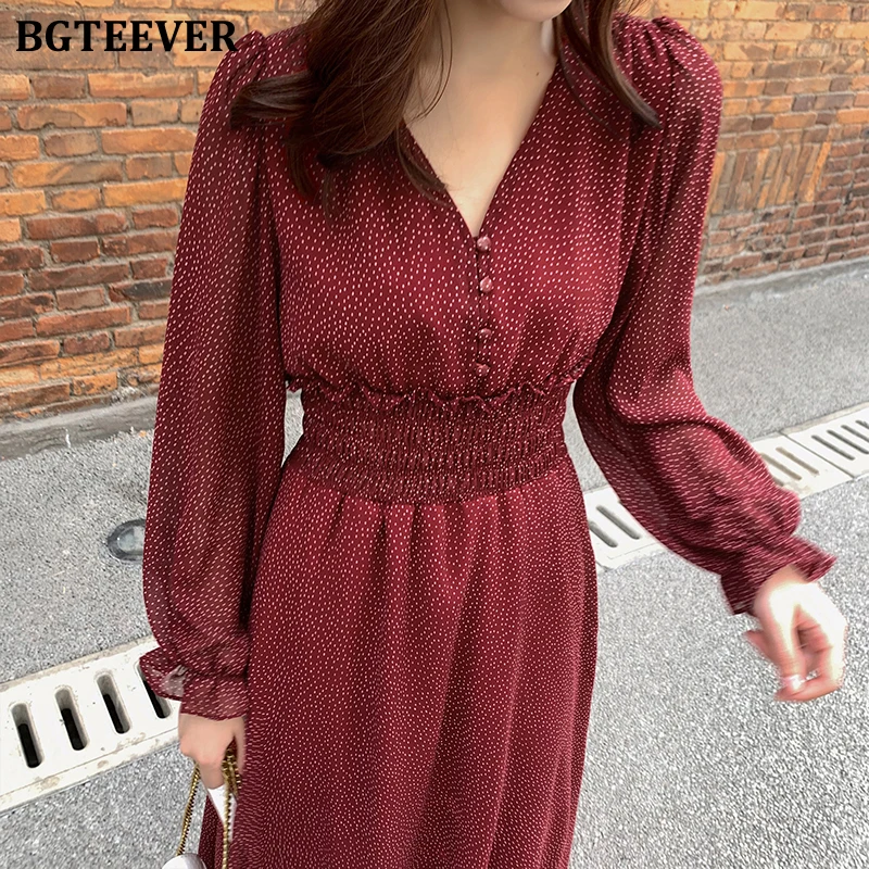 BGTEEVER модное платье миди в горошек для женщин ТРАПЕЦИЕВИДНОЕ шифоновое платье с v-образным вырезом на пуговицах стрейчевое женское платье с ...