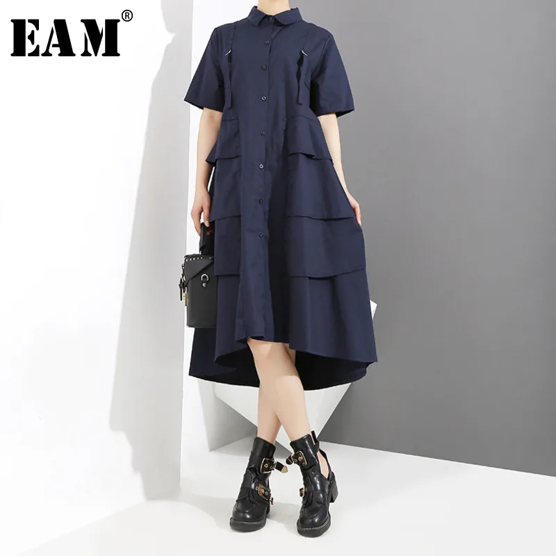 Женское платье-рубашка EAM, синее платье-рубашка средней длины с пряжкой и коротким рукавом, 1T437, весна-лето 2020