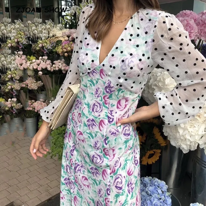 2020 винтажное платье с v-образным вырезом, контрастным узором в горошек, цветочным принтом, длинным рукавом, женское корейское платье средней...
