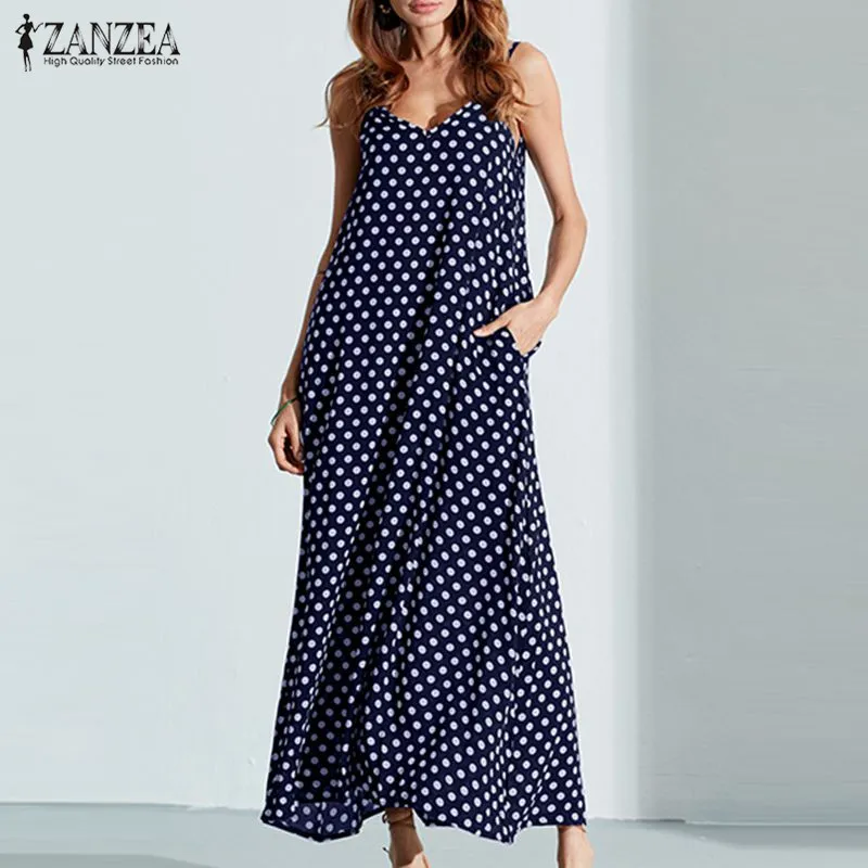 S-6XL размера плюс летнее платье 2019 ZANZEA женское платье в горошек с v-образным вырезом без рукавов свободное Макси длинное пляжное винтажное платье
