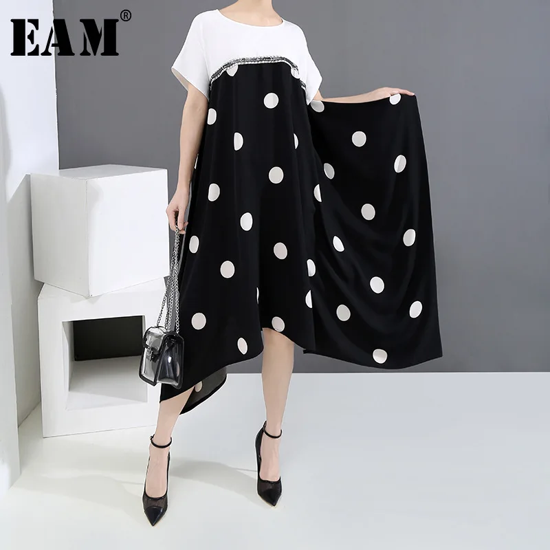 Женское платье с принтом EAM, черное платье большого размера в горошек, с круглым вырезом и коротким рукавом, весенне-летняя мода 2020 1U154