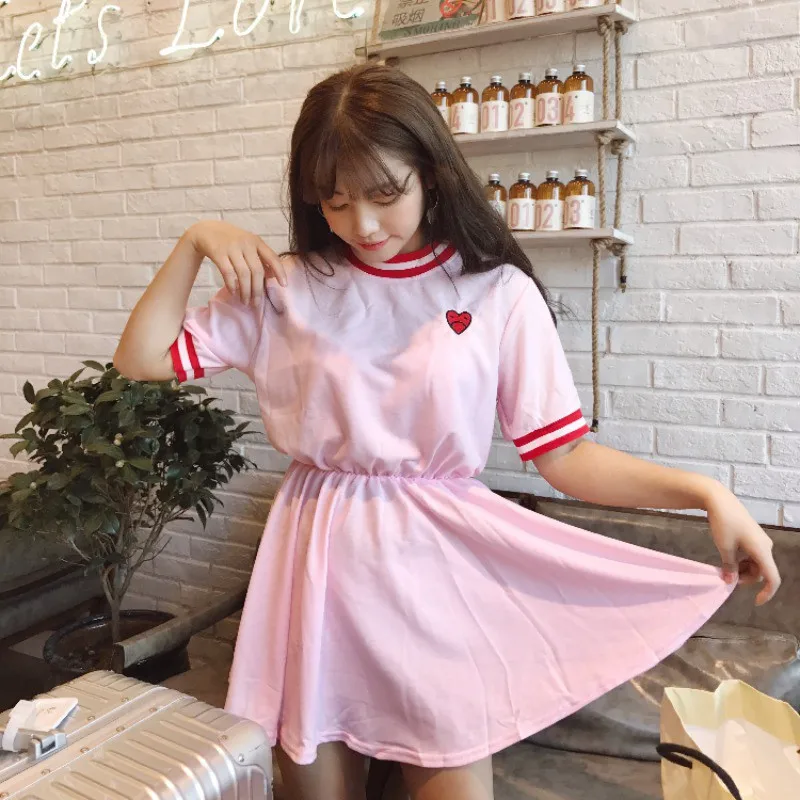 Милое платье для женщин, милое платье с принтом сердца, тонкое женское платье с коротким рукавом и круглым вырезом в стиле Харадзюку