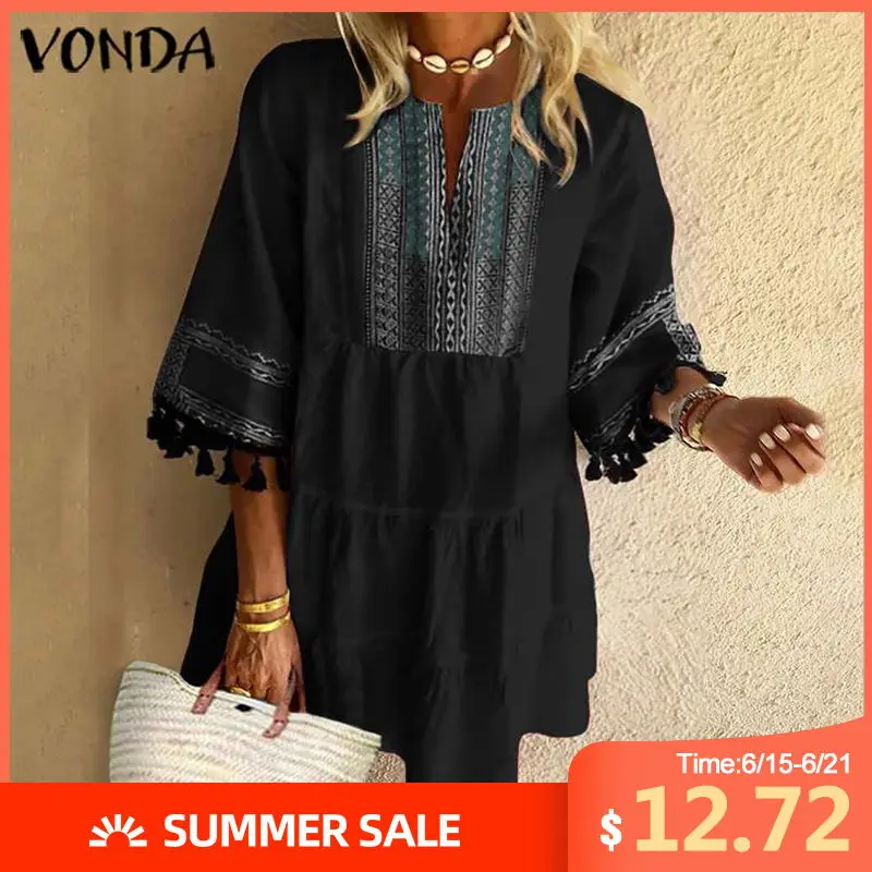 Платье с принтом размера плюс, VONDA, женское сексуальное мини-платье с v-образным вырезом и коротким рукавом с кисточками, свободный пляжный с...
