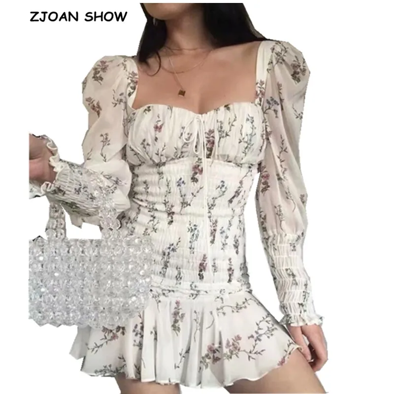 Женское эластичное платье с оборками, бежевое короткое платье с мелким цветочным принтом и длинными рукавами-буфами, облегающее платье мин...