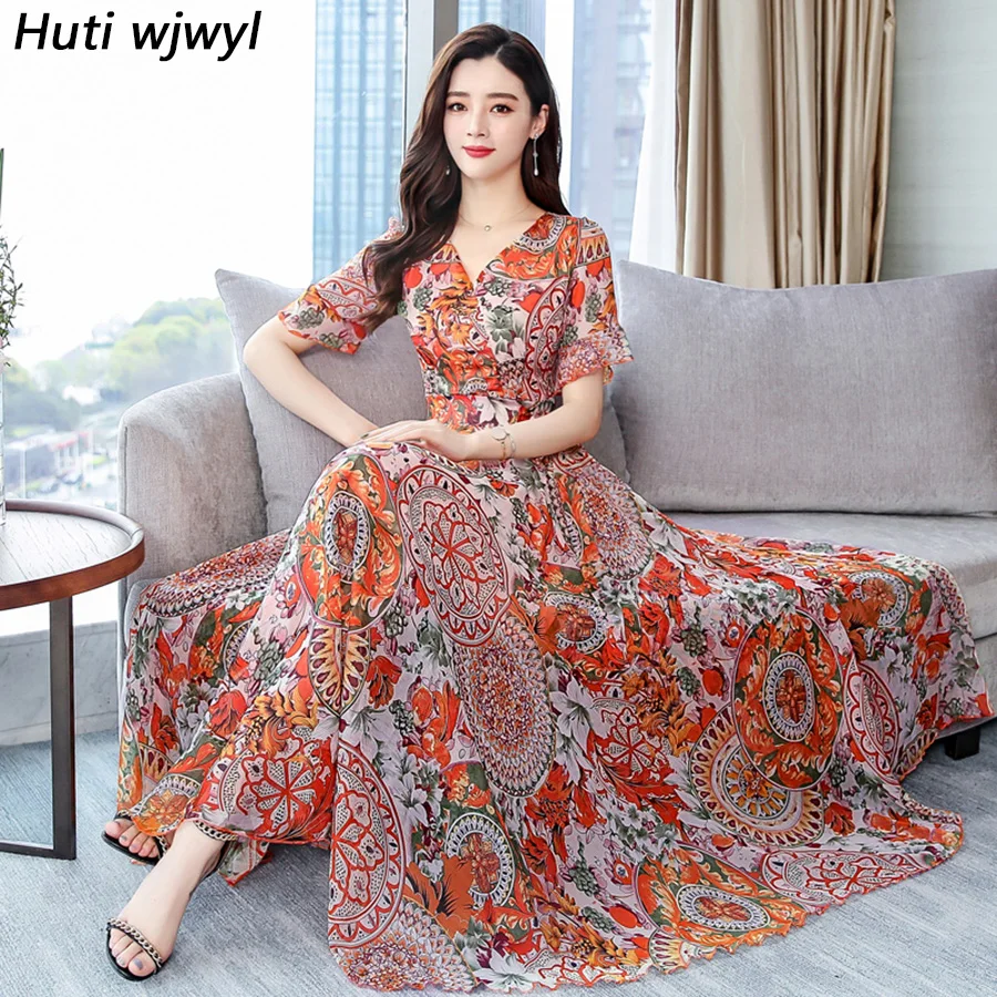 2019 Винтаж печати шифон Boho Макси Сарафан большого размера пляжный отдых миди летние платья Элегантный для женщин Bodycon Вечерние Vestidos