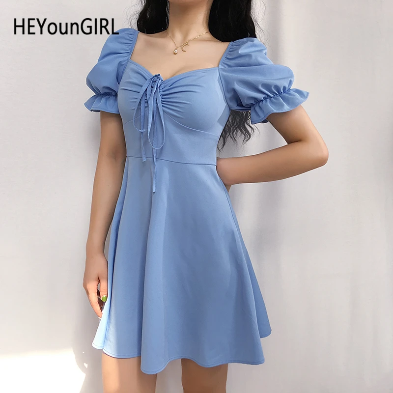 Женское плиссированное платье HEYounGIRL, элегантное винтажное платье-фонарик с коротким рукавом, свободное короткое летнее платье с высокой талией