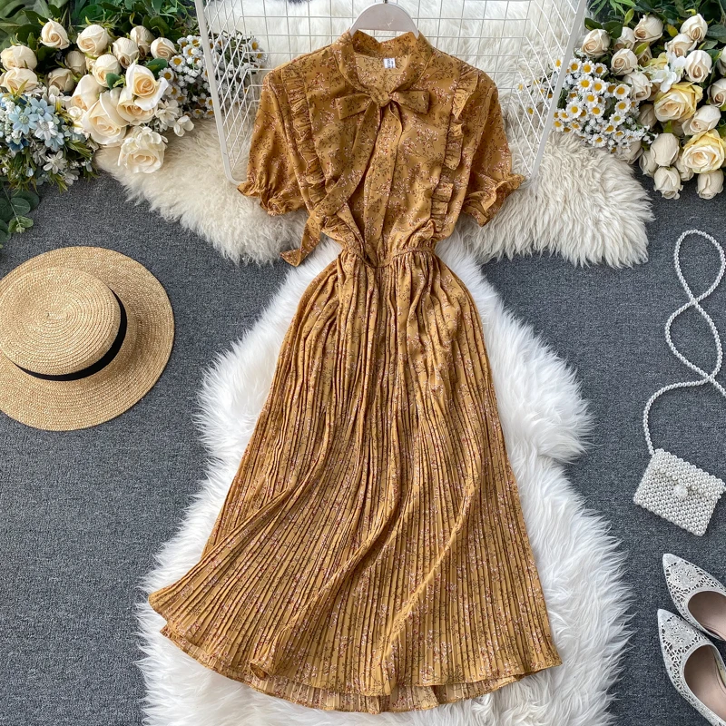 2020 весенне-летние женские платья с оборками и галстуком-бабочкой, винтажное элегантное платье с коротким рукавом, тонкое шифоновое платье миди с цветочным принтом для женщин