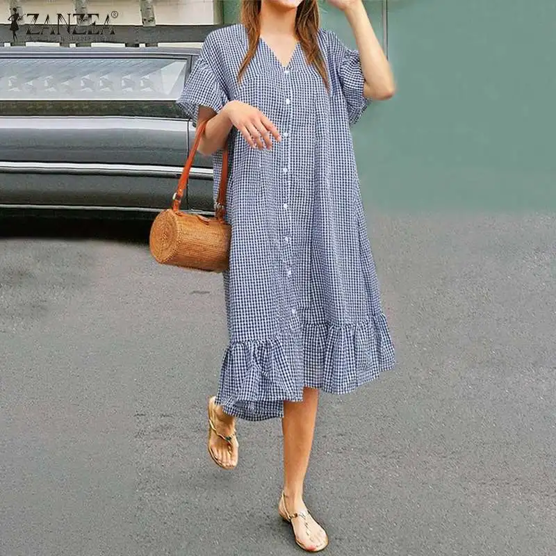 Стильное платье-рубашка с оборками, женский сарафан в клетку, ZANZEA 2020, Повседневное платье средней длины с коротким рукавом, женское платье с v-образным вырезом, большой размер 5XL
