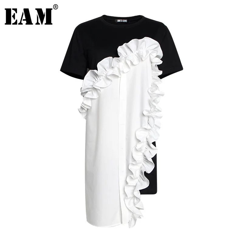 [EAM] 2019 Новый сезон: весна–лето шею короткий рукав черные свободные оборками трехмерная свободное платье Для женщин Мода JR674
