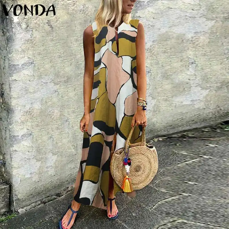 Богемное женское винтажное платье с принтом 2020 VONDA, летнее повседневное Свободное длинное платье Maix, сексуальное платье с v-образным вырезом без рукавов, раздельное праздничное платье