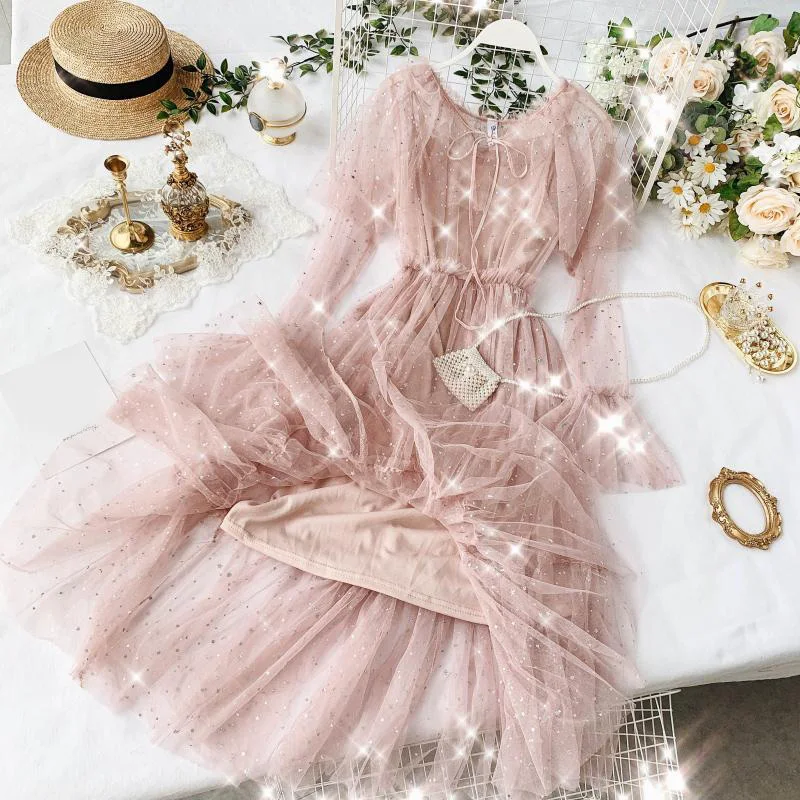 Сетчатое платье принцессы с блестками; Прозрачное платье с высокой талией; ТРАПЕЦИЕВИДНОЕ ПЛАТЬЕ с расклешенными рукавами для девочек; пла...