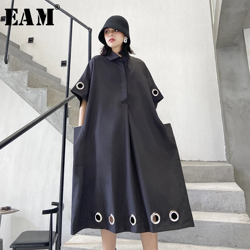 Женское платье-рубашка EAM, черное платье-рубашка большого размера с отворотом и рукавом три четверти, свободный крой, весна-осень 2020, 1T766