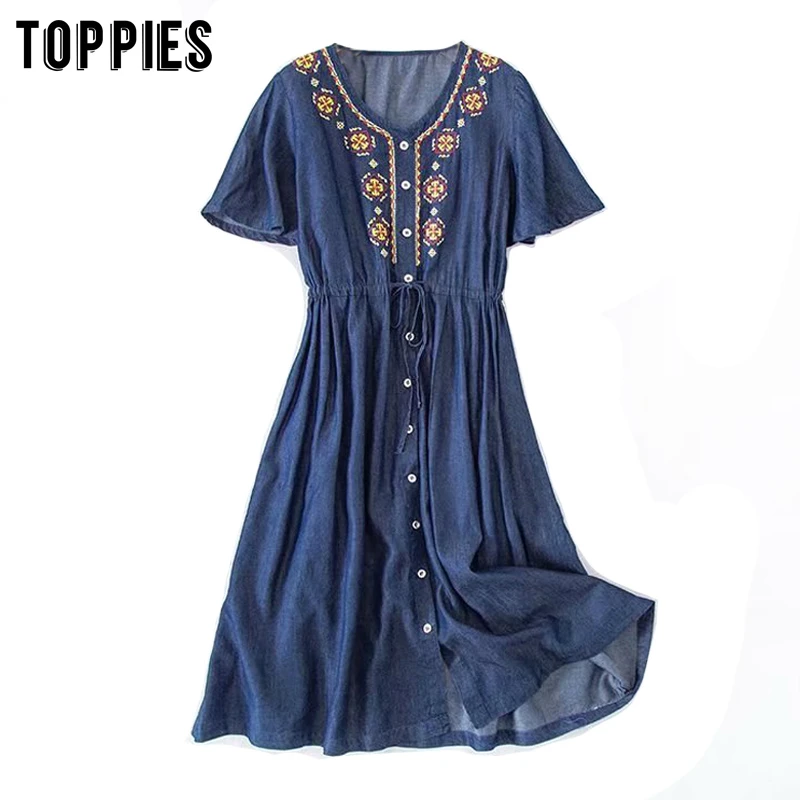 Винтажное джинсовое платье в стиле бохо; Летнее платье средней длины с короткими рукавами; Платье трапециевидной формы с вырезами