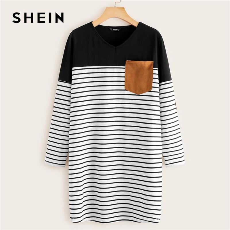 SHEIN черно-белое платье с карманом и заплатками в полоску, женское весеннее платье с длинным рукавом, Женские базовые прямые Короткие повседн...