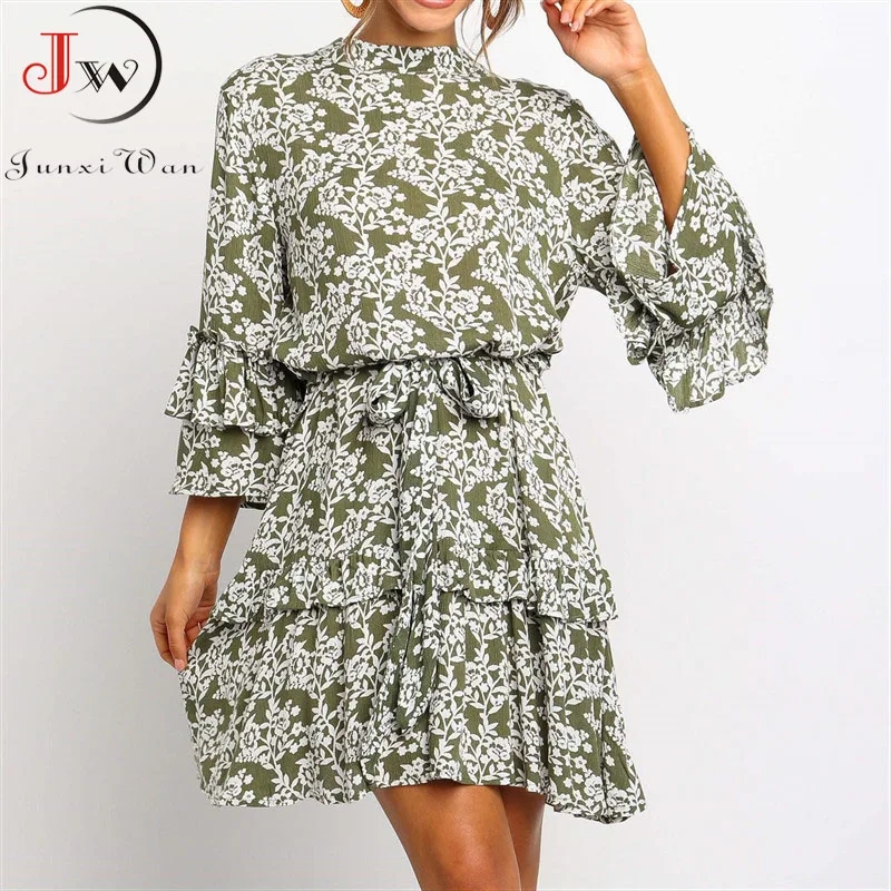Новинка, весеннее шифоновое платье с принтом и высоким воротником, женское летнее платье, 3/4 рукав, высокая талия, мини вечерние платья, винт...