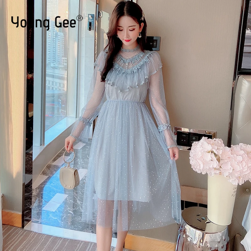 Young Gee, женские кружевные платья с оборками, элегантные, весенние, летние, вечерние, высокая талия, бисер, кисточка, пачка, миди, тонкое платье феи, Vestidos