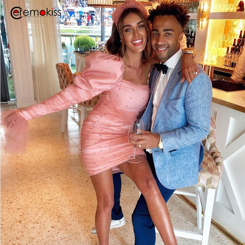 Ceremokiss женское платье с вырезом лодочкой на одно плечо с рюшами мини-платье сексуальное жемчужное Сетчатое платье с пышными рукавами наряд з...