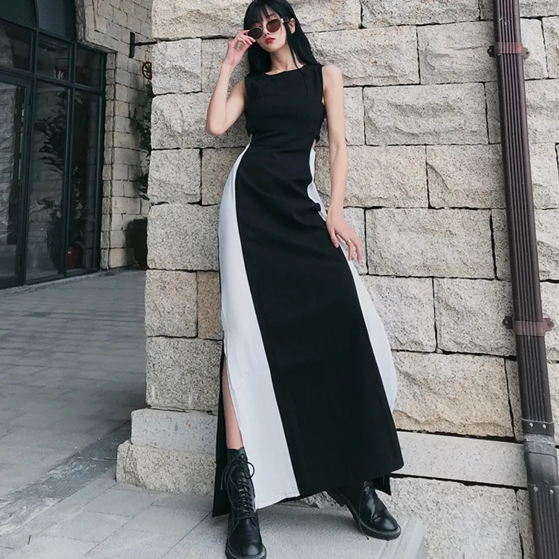 LANMREM 2020, круглый вырез, без рукавов, контрастные цвета, пуловер, бандаж, длина до пола, сексуальное платье для отпуска, женское платье, vestido WL07801L