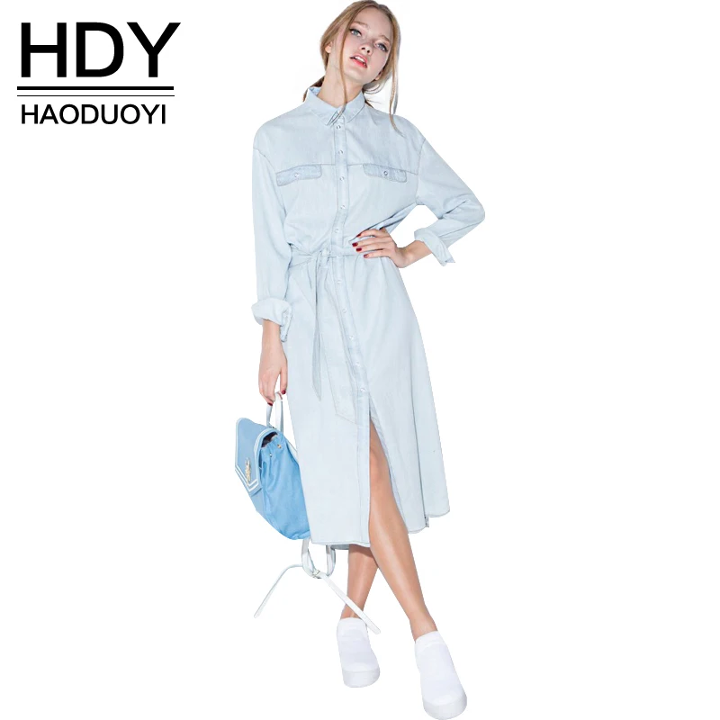 HDY Haoduoyi Для женщин ретро джинсовое платье передний Ремень Повседневное Винтаж Blue Solid рубашка-миди роковой Vestido Лидер продаж