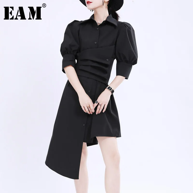 Женское платье-рубашка EAM, черное плиссированное платье большого размера с отворотом и длинным рукавом, свободный крой, весна-лето 2020 1U180