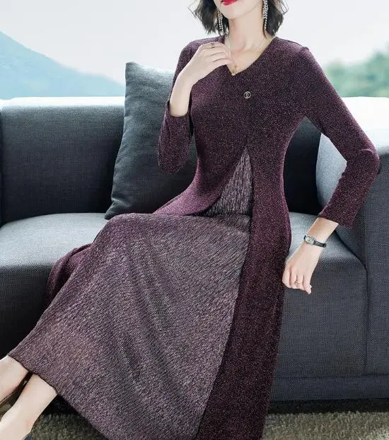 2019 осень Новое поступление, горячая Распродажа поддельные две части Вязание шифон женское длинное платье размера плюс M-5XL
