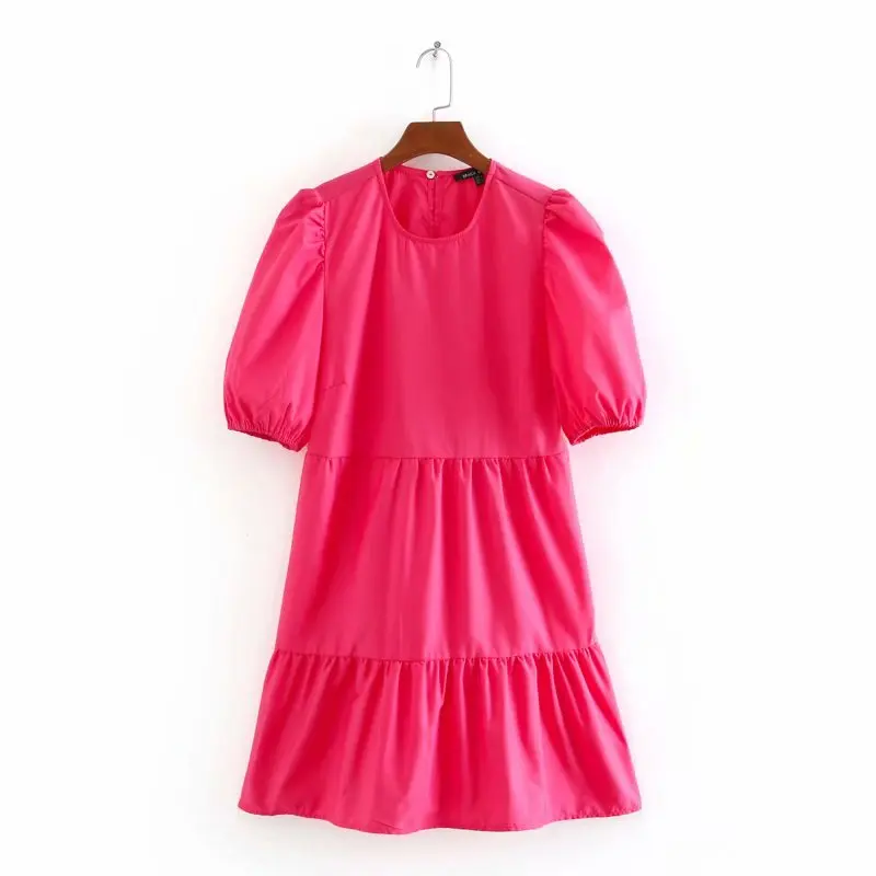 Новинка 2020 женское простое однотонное платье с круглым вырезом и коротким рукавом, Повседневное платье из поплина, женские платья с пышными рукавами, шикарные плиссированные платья