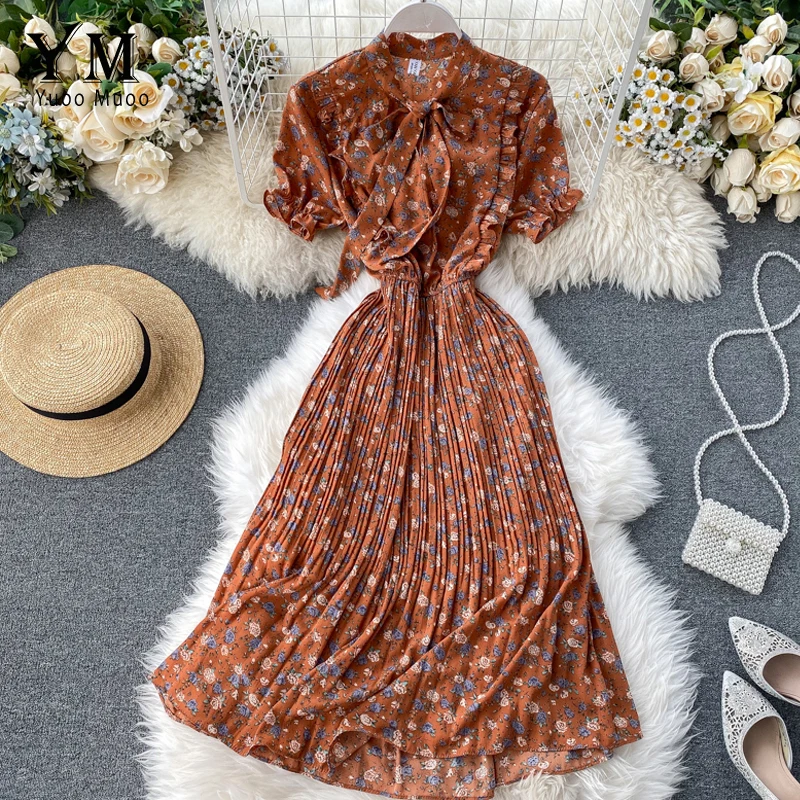 YuooMuoo женское шифоновое платье с бантом на шее, летнее плиссированное платье с цветочным принтом, женское винтажное платье миди с коротким рукавом и рюшами, Vestidos