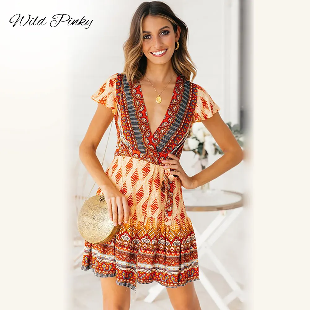 Женское платье с цветочным принтом WildPinky, Летнее мини-платье в стиле бохо с коротким рукавом и треугольным вырезом