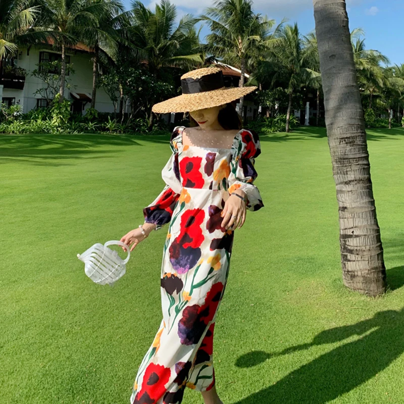 Женское платье с цветочным принтом, винтажное длинное платье трапециевидной формы с вырезом лодочкой и рукавами-фонариками, летнее платье с длинным рукавом, 2019
