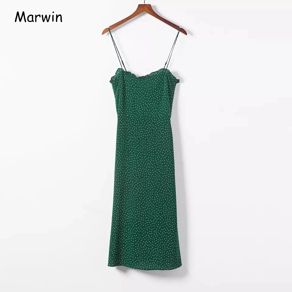 Marwin 2019 Новое поступление Лето Европейский ретро темно-зеленый горошек Спагетти ремень Кружева Сплит высокий уличный стиль без бретелек жен...