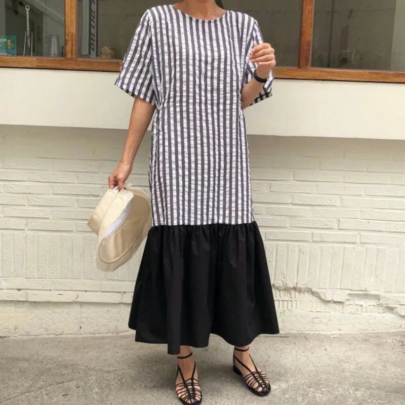 Корейское повседневное Полосатое женское платье с круглым вырезом и коротким рукавом, большие свободные миди платья, женская одежда 2020, модная летняя Новинка