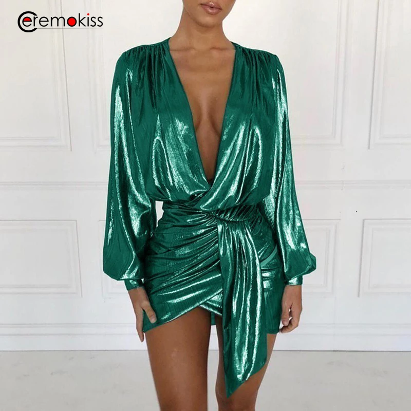 Ceremokiss блестящие вечерние платье Для женщин с длинным рукавом Осень золотые блестящие облегающее мини платье с рюшами элегантная пикантная ...