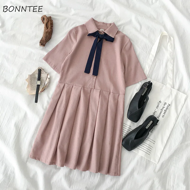 Женское платье с коротким рукавом простой элегантный универсальный корейский Стиль Повседневный милый розовый бант милый с высокой талией...