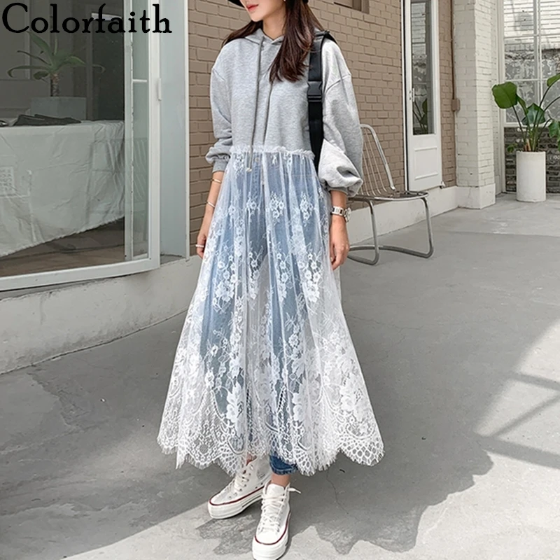 Colorfaith, новинка 2019, весеннее женское платье, ампир, длинное, пэтчворк, кружево, с капюшоном, повседневное, свободное, корейский стиль, прозрачное платье, DR7131