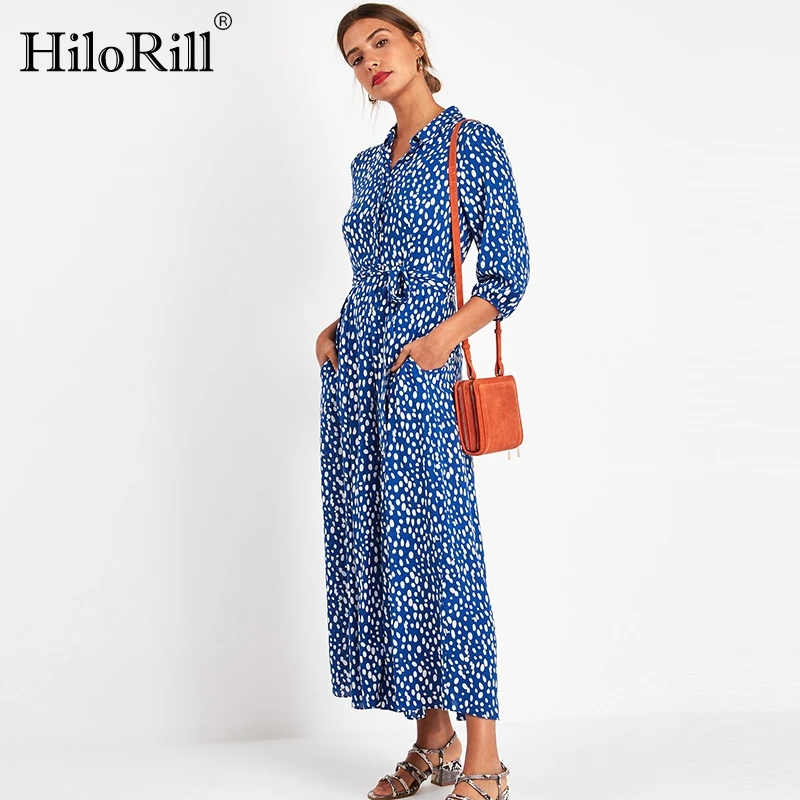 2020 женское Элегантное Длинное Платье с принтом, рукав три четверти, богемное Макси платье с отложным воротником, платье-рубашка, Vestidos Mujer