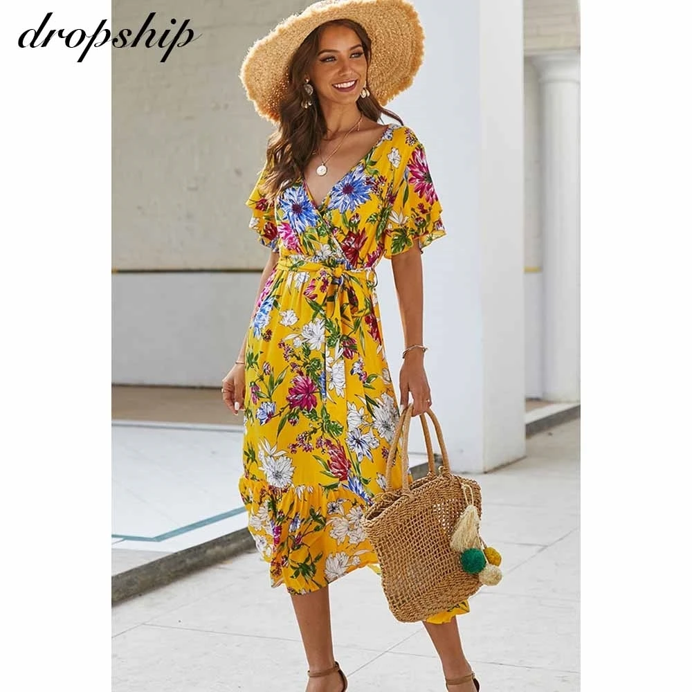 Прямая поставка, летнее платье миди с коротким рукавом, повседневное богемное платье с цветочным принтом, хлопковое пляжное платье с v-образным вырезом и оборками, летнее облегающее платье